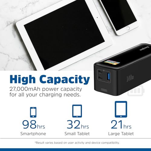 - يمكن أن توفر السعة العالية 27000mAh وقتًا إضافيًا للشاشة يصل إلى 98 ساعة للموبايل، و32 ساعة للتابلت الصغير، و21 ساعة للتابلت الكبير.