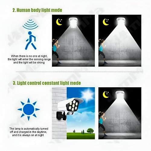 - يتميز مصباح مستشعر الحركة الذي يعمل بالطاقة الشمسية بـ 77 مصباح LED عالي السطوع ومستشعر بشري مدمج، مما يوفر إضاءة قوية في الليل مع الحفاظ على الطاقة خلال النهار مع الشحن الشمسي التلقائي، مما يجعله صديقًا للبيئة وفعال من حيث التكلفة.