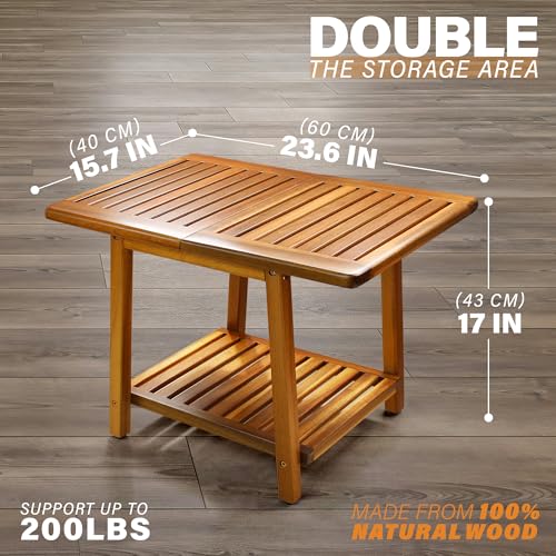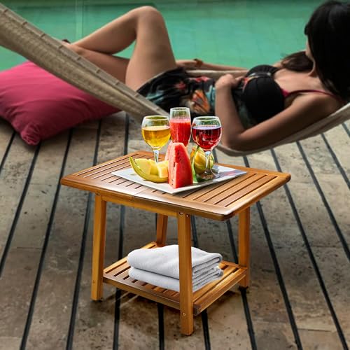 Enkezi - طاولة جانبية خارجية اكاسيا 24 انش من انكيزي، فناء متين بطبقتين مقاومة لعوامل الطقس، طاولة جانبية قوية الثبات للفناء وحمام السباحة والشرفة بلمسة نهائية من خشب الساج (بني اكاسيا)