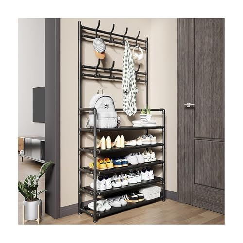 DESALOV - رف احذية للمدخل مع رف معطف من 5 طبقات لتنظيم الاحذية لغرفة النوم والسكن، اسود