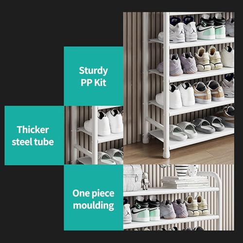 - 【رف أحذية للمدخل】مثالي للمدخل أو غرفة النوم أو الخزانة أو المسكن. الخطافات العلوية مريحة لتعليق القبعات والملابس وغيرها من الأشياء. تُستخدم الأرفف الخمسة السفلية لتخزين أحذيتك، ما يصل إلى 20 زوجًا من الأحذية (حسب عرض الحذاء).