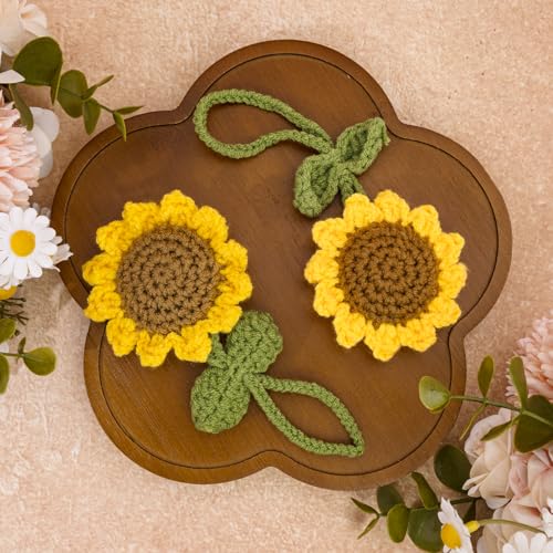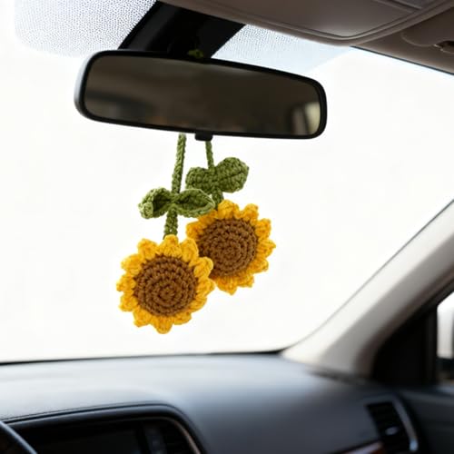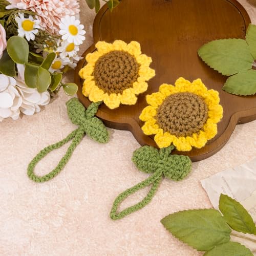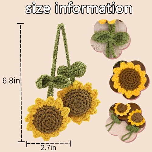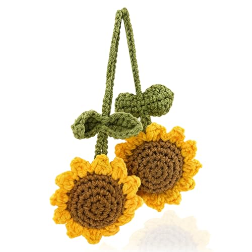 EoffIvan - سلسلة مفاتيح كروشيه بتصميم زهرة عباد الشمس من يوف ايفان، مجموعة من قطعتين مصنوعة يدويا بتصميم لطيف للتعليق على مراة السيارة، هدايا ديكور للنساء