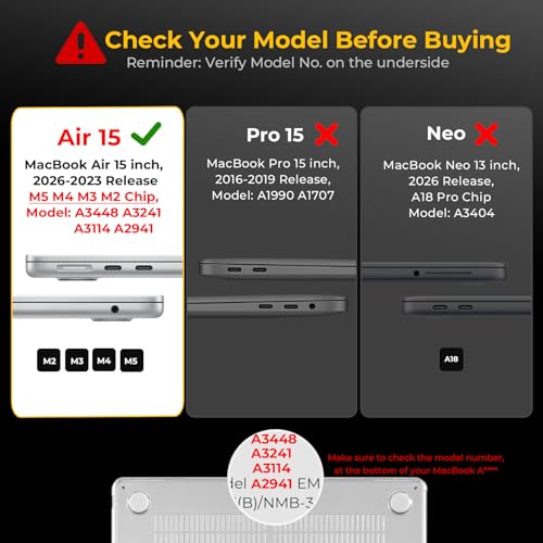 - ملاءمة مثالية ومظهر رفيع: متوافق فقط مع ماك بوك اير 15 انش M5 M4 M3 M2 مع شاشة ليكويد ريتينا وخاصية تاتش اي دي 2026 2025 2024 2023 رقم الموديل: A3448 A3241 A3241 A3114 A2941، يرجى تحقق من طراز الكمبيوتر المحمول " AXXXX" على الظهر قبل الشراء. غير متوافق مع الموديلات الأخرى