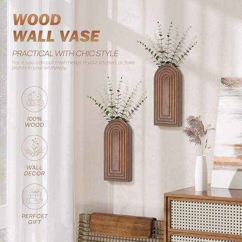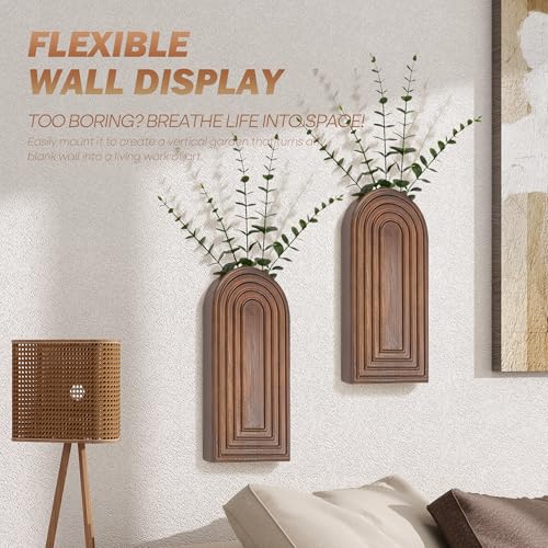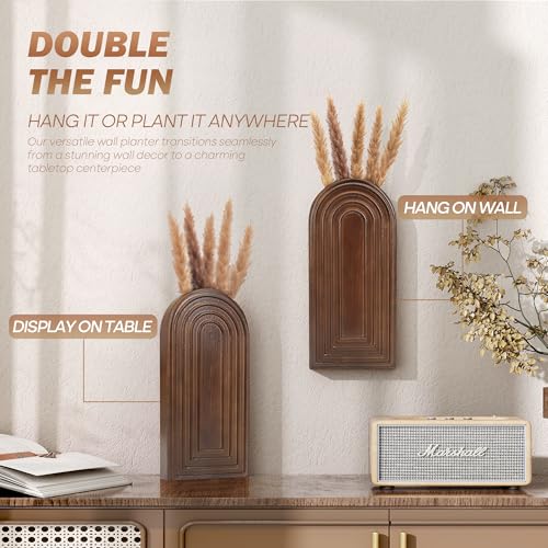 EOSAHR - مجموعة فازات جدارية من خشب الصنوبر للنباتات والزهور الداخلية، زينة فنية جدارية لمنزل المزرعة لغرفة المعيشة والمكتب وديكور المنزل، أصيص نباتات معلقة مع ديكور بوهيمي للنباتات الصناعية من يوساهر (بني)