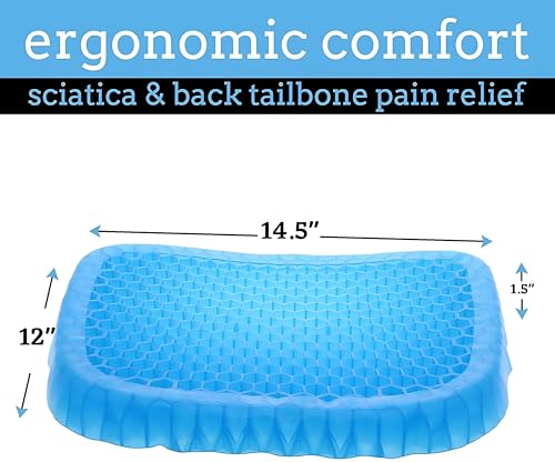 - يساعد نمط قرص العسل المبتكر على تدفق الهواء بشكل مثالي، مما يمنع تراكم الحرارة والتعرق بين الفخذين والأرداف، بينما تدعم مادة الجل الناعمة عظم الذنب وتوزع الوزن بالتساوي، مما يعزز الراحة أثناء الجلوس بشكل عام.