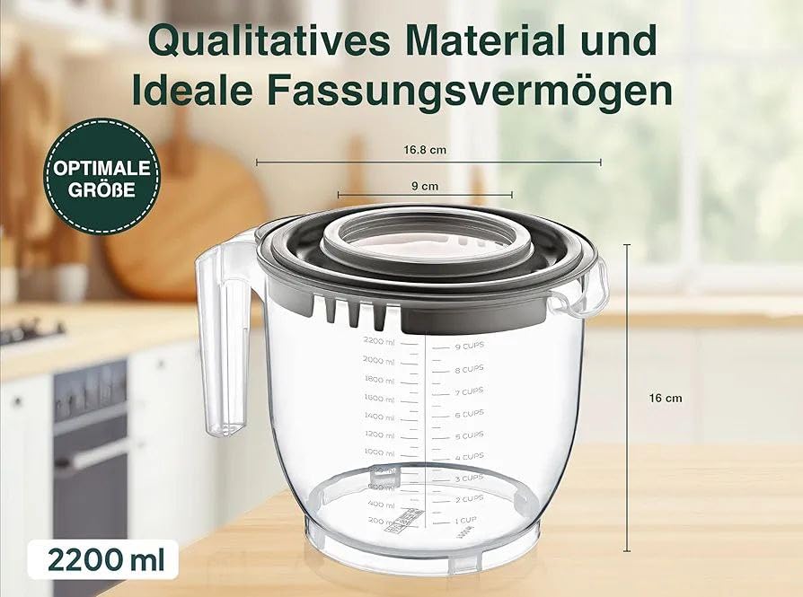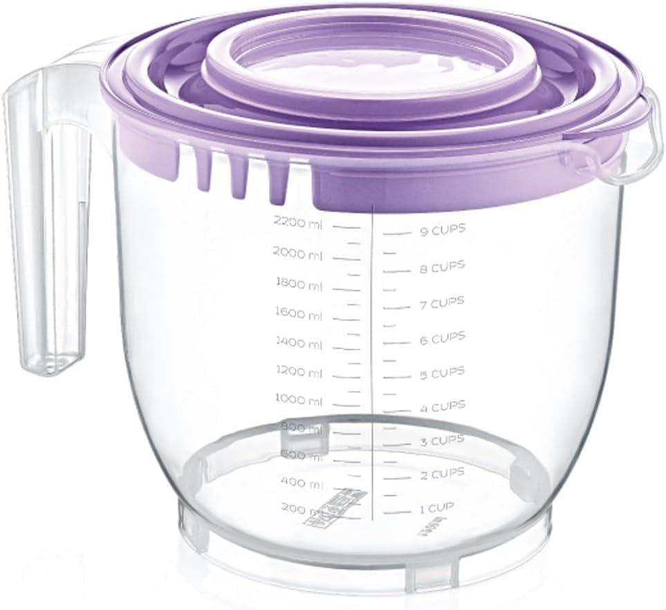 - تصميم متدرج مع يد مريحة: يسمح الهيكل الشفاف المتدرج بقياس دقيق للمكونات، بينما يوفر المقبض المتين قبضة مريحة لسهولة الصب والتحكم، حتى عندما يكون الإبريق ممتلئًا.