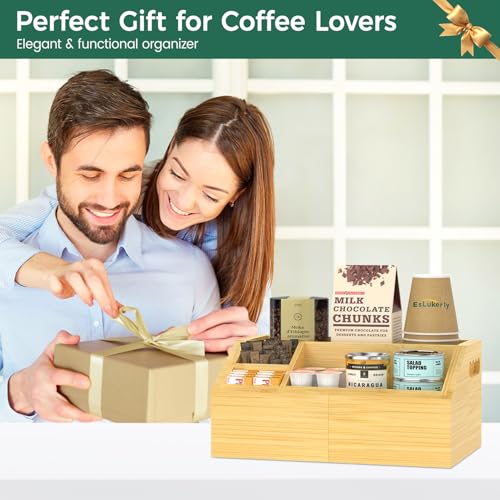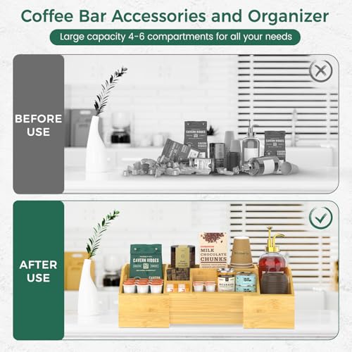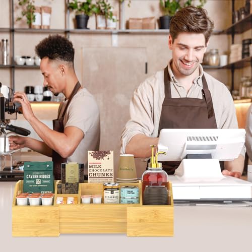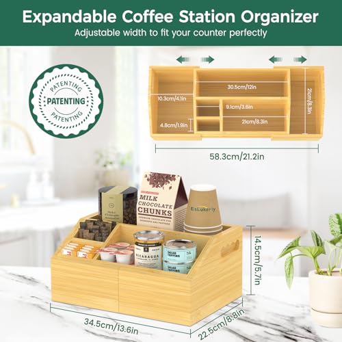 EsLuker.ly - حامل بار قهوة كادي من البامبو قابل للتمدد لتخزين التوابل، حامل كبسولات للمنزل والمكتب وركن منطقة المطبخ ومنظم الإكسسوارات، منظم ركن القهوة لسطح العمل من إيسلوكر.لي