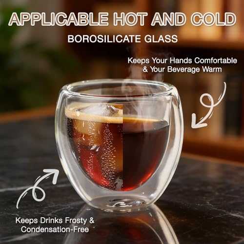 - مجموعة أكواب اسبريسو مكونة من 6 قطع: أكواب اسبريسو بسعة 80 مل مصنوعة من زجاج البوروسيليكات مزدوج الجدران وسميك متين بشكل خاص وتتميز أكواب الإسبريسو مزدوجة الجدران بمقاومة عالية للبرودة والحرارة. تحافظ أكواب الإسبريسو على مشروباتك الدافئة ساخنة لفترة أطول وتبرد مشروباتك الباردة لفترة أطول