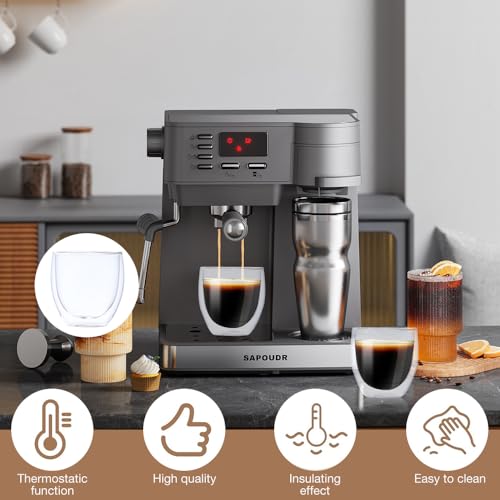 - تصميم مزدوج: توفر أكواب الإسبريسو ذات الجدران المزدوجة عزلًا ممتازًا يحمي يديك من درجات الحرارة القصوى. أكواب اسبريسو بفضل العزل المزدوج الجدار، لا تسخن بعد تحضير الإسبريسو، ولكن سائل أكواب الإسبريسو مزدوجة الجدران بالداخل لا يزال دافئًا