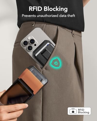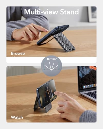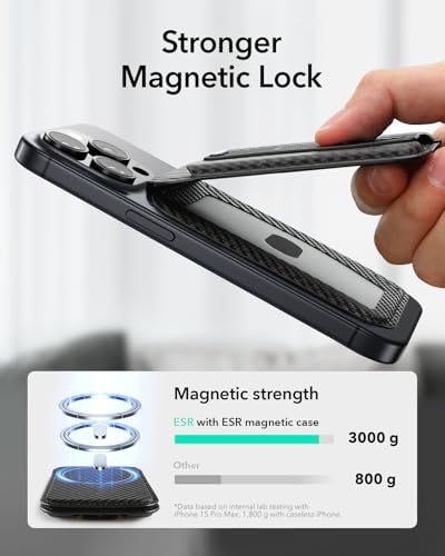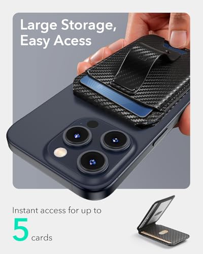 ESR - جراب مع محفظة ماج سيف، 5 حامل بطاقات، مع حامل قابل للتعديل وحلقة إصبع لإحكام الإمساك، محفظة مغناطيسية لآيفون 15/14/13/12، من الجلد النباتي من اي اس ار، لون أسود من الألياف الكربونية