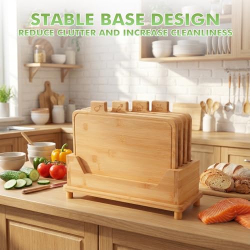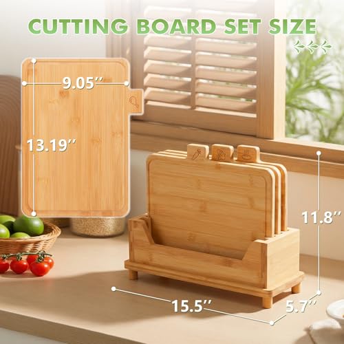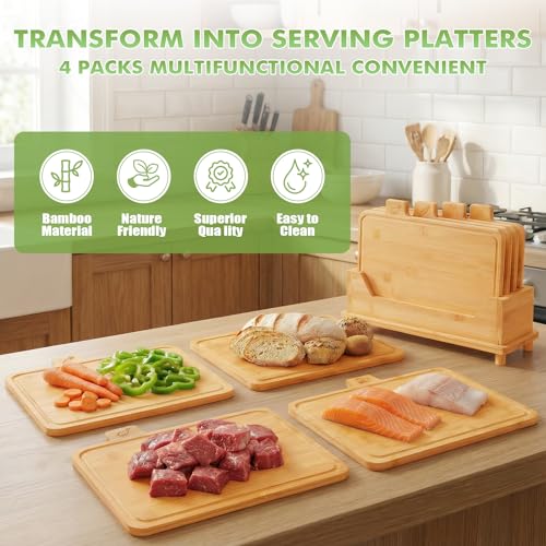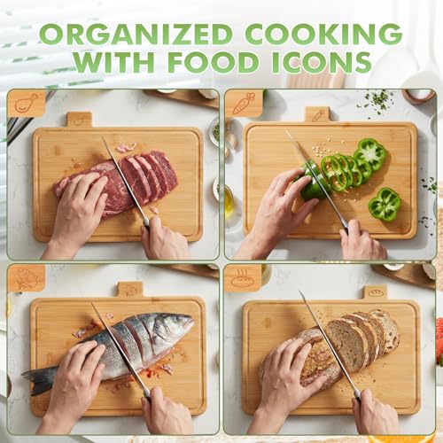 Essenhome - مجموعة الواح تقطيع كبيرة من الخيزران من ايسن هوم مكونة من 4 قطع - مجموعة الواح تقطيع خشبية مع حامل - مجموعة الواح تقطيع مع ايقونات طعام واخاديد عصير