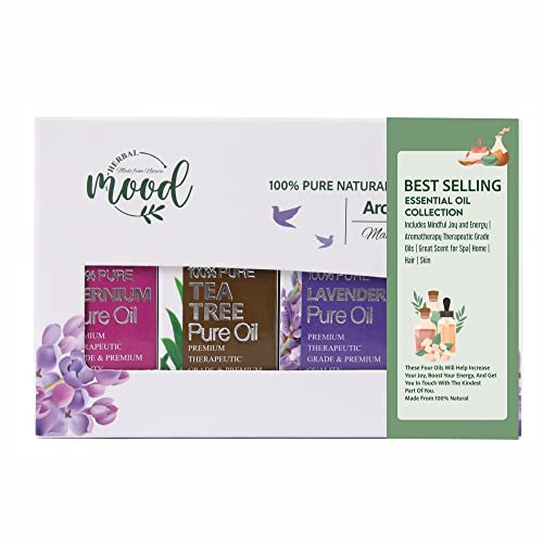 Herbal Mood - مجموعة الزيوت العطرية الاكثر مبيعا، صندوق هدايا يتضمن اللافندر والروزماري والغرنوقي وشجرة الشاي، رائحة رائعة للمنتجعات الصحية مناسبة لتعطير المنزل والشعر والبشرة