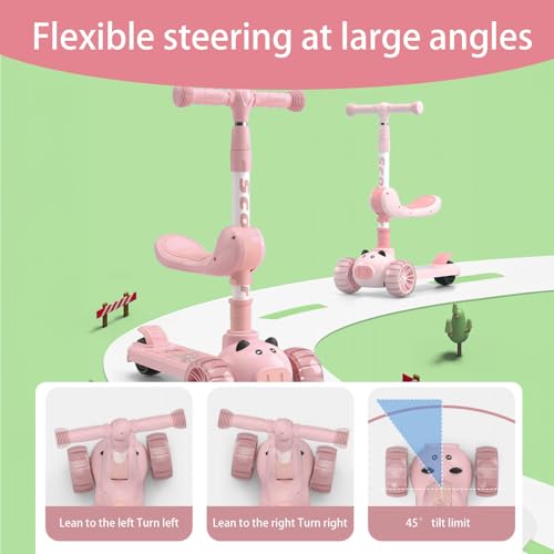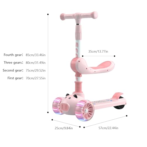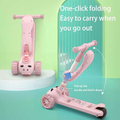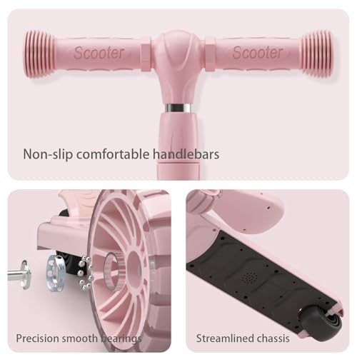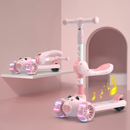 ESYAMIPET - سكوتر للأطفال 3 في 1 من ايزياميبت، مقعد قابل للطي بأربعة أوضاع ارتفاع قابلة للتعديل، عجلات ليد من البولي يوريثان، 3 عجلات للبنات والأولاد للاستخدام الداخلي والخارجي، لون وردي