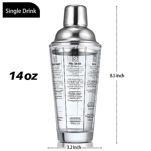 Etens - شاكر كوكتيل زجاجي من ايتنس، شيكر مارتيني بسعة 14 أونصة مع وصفات على الجانب | شاكر بار شفاف مع قياسات | مصفاة مدمجة مع سدادة | مشروبات كريستال مارجريتا شاكر