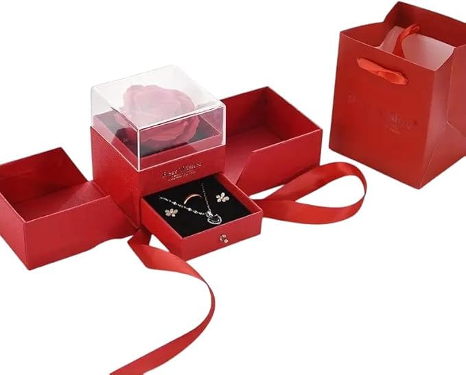 - ღ أفكار هدايا فريدة: يوجد داخل العلبة درج حيث يمكنك وضع بعض المجوهرات كهدية في يوم خاص. يمكنك أيضًا وضع هديتك، تمامًا مثل الخاتم أو السلسلة أو البروش أو الحلقان أو المجوهرات الأخرى في الدرج أو في منتصف الوردة لتقديم مفاجأة كبيرة لمتلقي الهدية. علبة مجوهرات مزينة بزهرة تمثل حبك الأبدي.