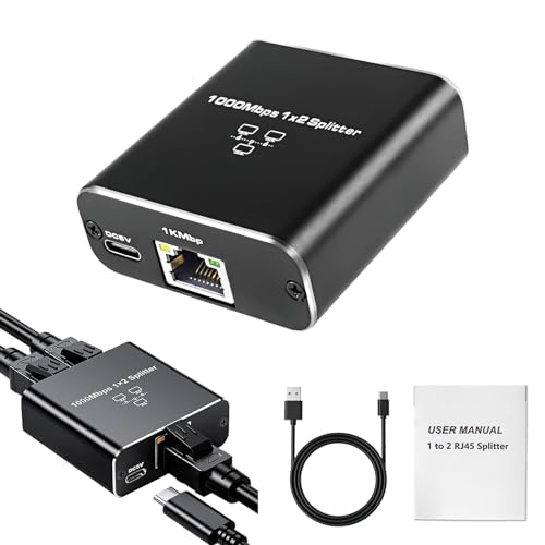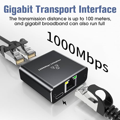 Wisesurf - موزع إيثرنت من 1 إلى 2 بسرعة 1000 ميجابت لكل ثانية RJ45 بمنفذين جيجابت مع كابل طاقة من النوع سي لـ كات 5/5e/6/7/8 محور الكمبيوتر راوتر ايه دي اس ال سيت توب بوكس التلفزيون الرقمي