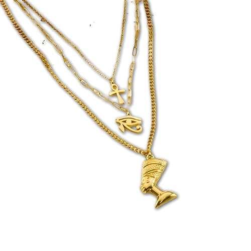 Generic - قلادات بدلايات عرقية - مجموعة من ثلاث سلاسل بدلايات عنخ ونفرتيتي تعرض خطوط علم الخريطة العالمية، تصميم للجنسين بطول الترقوة، مثالية للازياء الفريدة والتقدير الثقافي