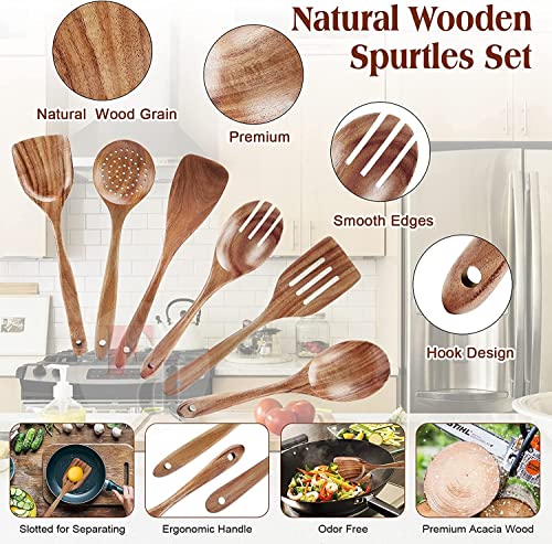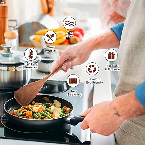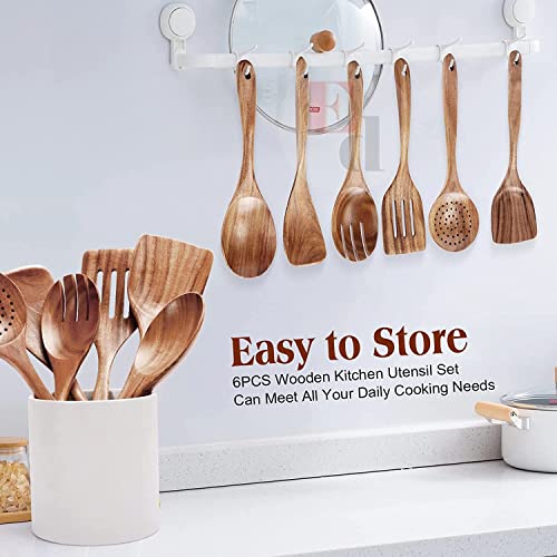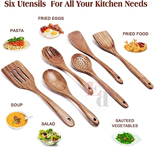 EthoweDen - مجموعة ملاعق خشبية للطهي وتقديم الطعام، 6 قطع من أدوات المطبخ، مجموعة ملاعق مسطحة - مقاومة للحرارة وغير لاصقة ومريحة بقبضة ناعمة، لمسة نهائية فاخرة من خشب النيم من ايثو دين
