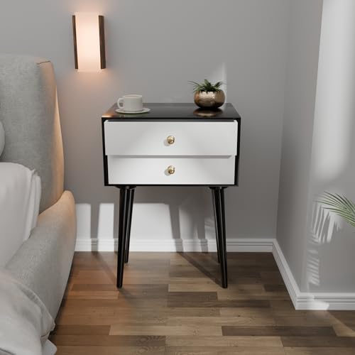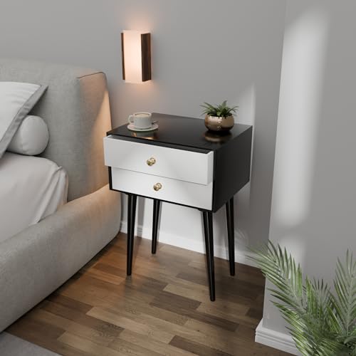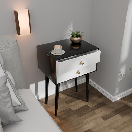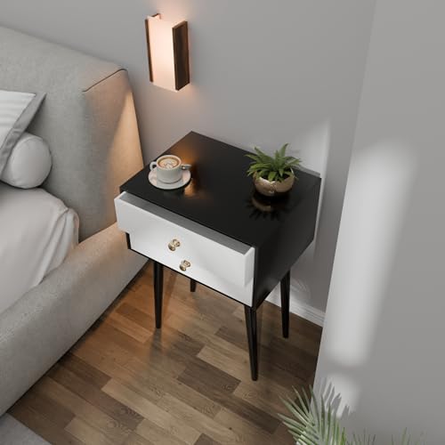 ETIQUETTE ART - طاولة جانبية عصرية من ايتيكيت ارت بارجل خشبية صلبة، طاولة جانبية بسيطة وعملية مع درج للتخزين، سهلة التجميع (اسود وابيض)