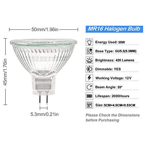 - ✔【متعددة الوظائف】لمبة هالوجين MR16 بقدرة 12 فولت و35 وات مثالية للاستخدام في المكاتب، المتاجر، المدارس، تنسيق الحدائق، المعارض، المنازل، الفنادق، المتاحف، المطاعم، محلات البيع بالتجزئة / لمبات بملاءمة شاملة.