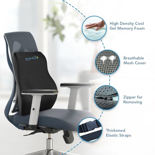 Everactiv by HCAH - وسادة ظهر لتقويم العظام من ايفراكتيف من اتش سي ايه اتش، وسادة جل باردة، دعم قطني لمقعد السيارة - مصممة لتخفيف الام الظهر - وسادة ظهر مثالية للمنزل والمكتب والسيارة (اسود شبكي، L)