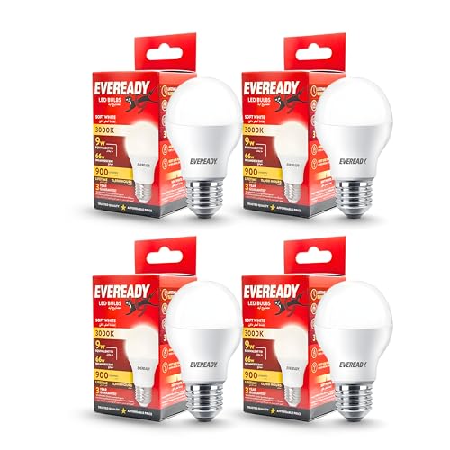 Energizer - مصباح ليد بقاعدة E27 9 وات، 900 لومن من ايفريدي، 4 لمبات (دافئ، 3000 كلفن)