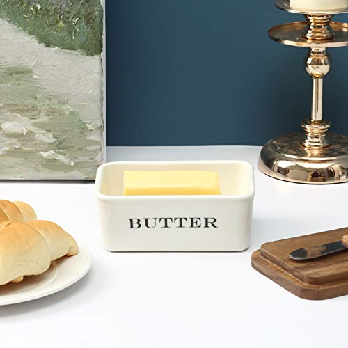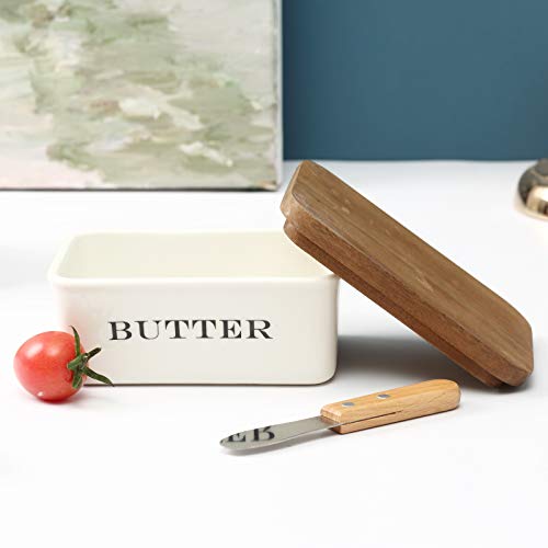 everous - طبق زبدة من ايفروس - وعاء زبدة جميل لديكور المطبخ الريفي مع غطاء خشبي وسكين (أبيض)