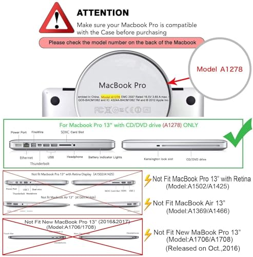 - 💻مصمم خصيصًا لجهاز ماك بوك برو 13.3 انش. موديل إصدار 2012 / 2011 / 2010 / 2009 A1278. يرجى التحقق من رقم الموديل "A1xxx" على ظهر جهاز ماك بوك قبل الشراء. ملاحظة: لن تناسب حافظة ماك بوك برو 13 الإصدار القديم برو ريتينا 13 بوصة، بدون قرص مضغوط (الموديل: A1502/1425) / 2011 6 & 2017 الإصدار برو ريتينا 13 بوصة، مع أو بدون شريط لمس (الموديل: A1706/1708).