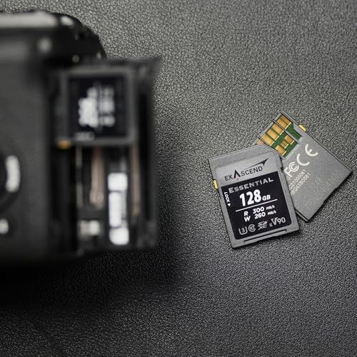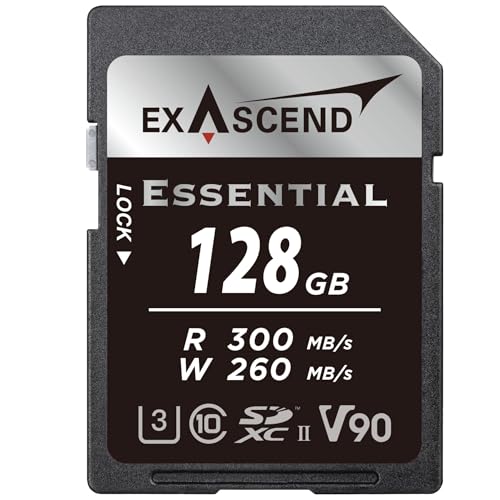 Exascend - بطاقة ذاكرة اسنشال 128 جيجابايت SDXC UHS-II بسرعة كتابة 260 ميجابايت في الثانية، دقة 4K UHD، فئة UHS-II، الفئة 10 وU3 وV90، مثالية لكاميرات التصوير عالية الأداء من اكساسيند