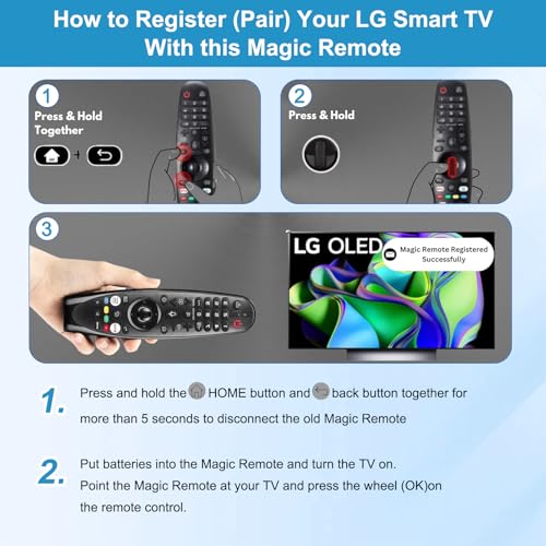 - اقتران بدون قلق: أولاً، ضع البطارية في الجزء البديل لجهاز التحكم السحري المتوافق مع تلفزيونات ال جي، ثم قم بتشغيل التلفزيون. بعد ذلك، وجه جهاز التحكم السحري نحو التلفزيون الخاص بك واضغط مع الاستمرار على عجلة التمرير (زر موافق) على جهاز التحكم الخاص بك للتلفزيون الذكي. بمجرد ظهور مربع حوار التسجيل الناجح على شاشة التلفزيون، يصبح جهاز التحكم البديل جاهزًا للاستخدام (ملاحظة: جهاز التحكم لا يأتي مع بطاريات)