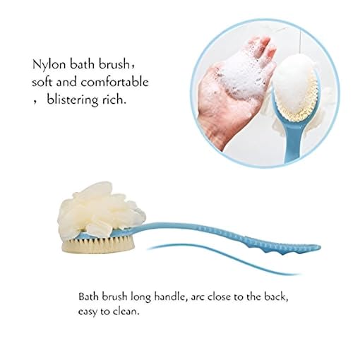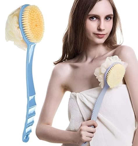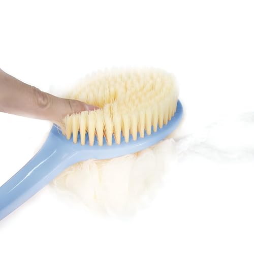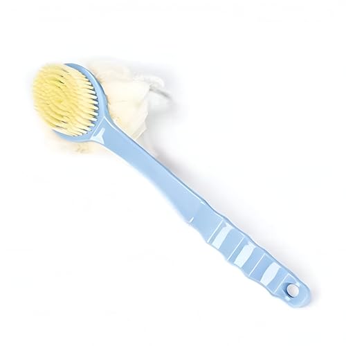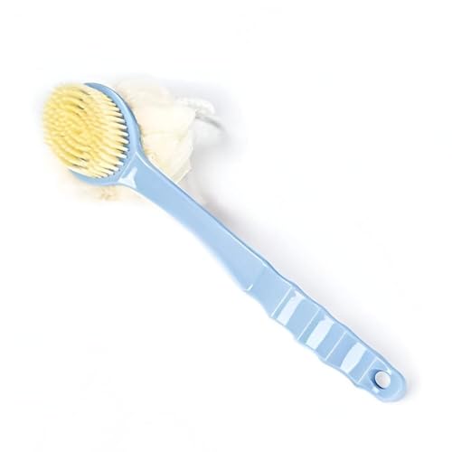 Generic - فرشاة استحمام للتقشير - تصميم مزدوج الجوانب 2 في 1 بشعيرات ناعمة واسفنجة ليفة، ازرق، مقبض طويل 14.1 انش لتنظيف سهل