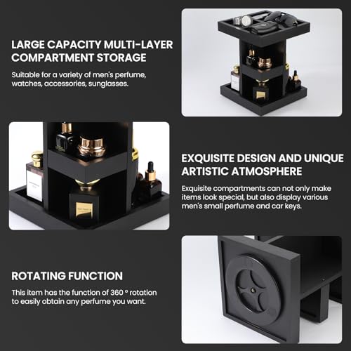 EXIN DECHEN - اكسين ديشين منظم كولونيا للرجال، حامل كولونيا، رف عطر خشبي بسعة كبيرة من 3 طبقات مع دوار، حامل عرض العطور، منظم منضدة السرير، هدايا للرجال (اسود)