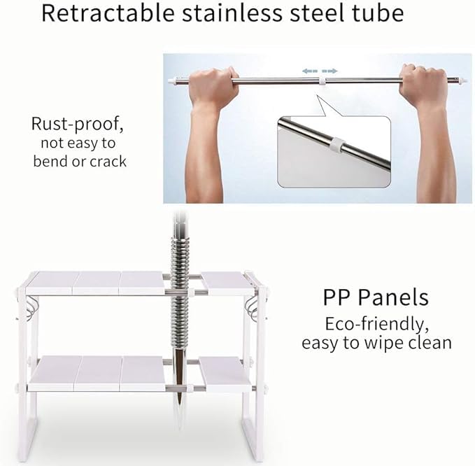 Generic - منظم أغراض تحت الحوض قابل للتوسيع مكون من طبقتين، منظم رفوف قابل للتعديل مع 10 ألواح قابلة للإزالة وأنابيب من الفولاذ المقاوم للصدأ مع خطافات، رف تخزين متعدد الاستخدامات