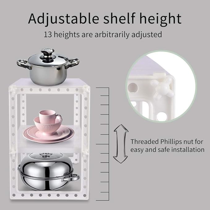 - 【تصميم بارتفاع قابل للتعديل】يوجد 13 فتحة عمودية لمساعدتك على تعديل ارتفاع رف التخزين بسهولة أكبر حسب احتياجاتك. كما يمكنك إزالة بعض القطع البلاستيك ليتلاءم خرطوم المياه أسفل الحوض بشكل أفضل.