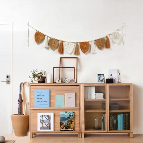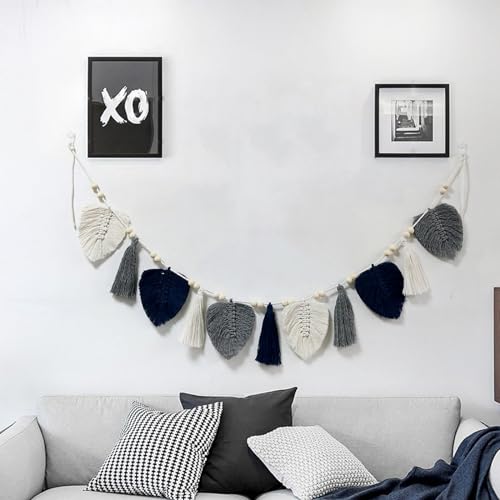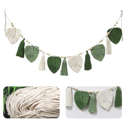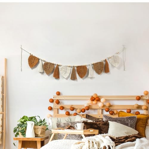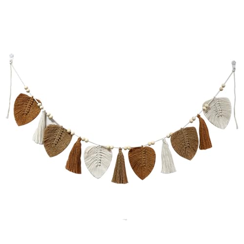 EXQUILEG - زينة من خيوط المكرمية بنمط بوهيمي للتعليق على الحائط بتصميم أوراق شجر من نسيج محبوك وأنيق، إكليل بشراشيب لغرفة النوم وغرفة المعيشة وغرفة الأطفال، لون كاكي