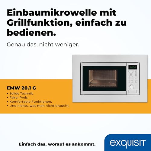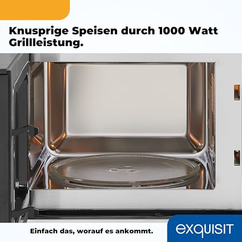 Exquisit - ميكروويف EMW 20.1G مدمج بحجرة طهي 20 لترًا وقوة 800 وات وتصميم من الفولاذ المقاوم للصدأ وقوة شواء 1000 وات و5 مستويات طاقة وتايمر وقرص دوار بقطر 24.5 سم و8 برامج طهي تلقائية وإضاءة داخلية من اكسكويزيت