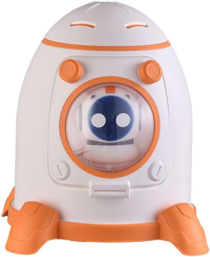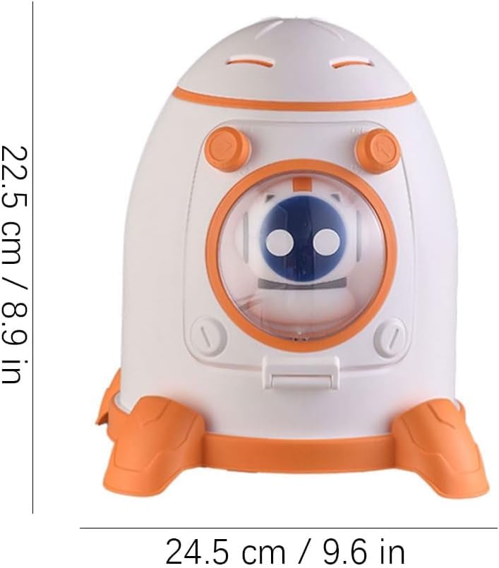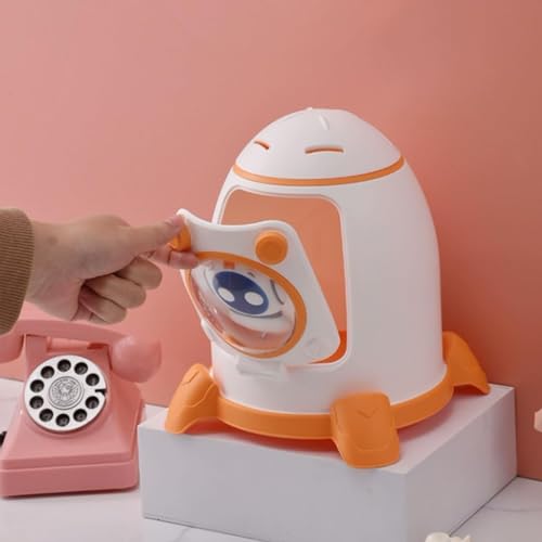 - مزايا التصميم: حصالة نقود على شكل صاروخ مع نظام ألوان أبيض وبرتقالي، تتميز بنافذة عرض وجه روبوت لطيفة وقاعدة ثابتة لوضع آمن.