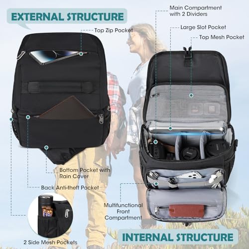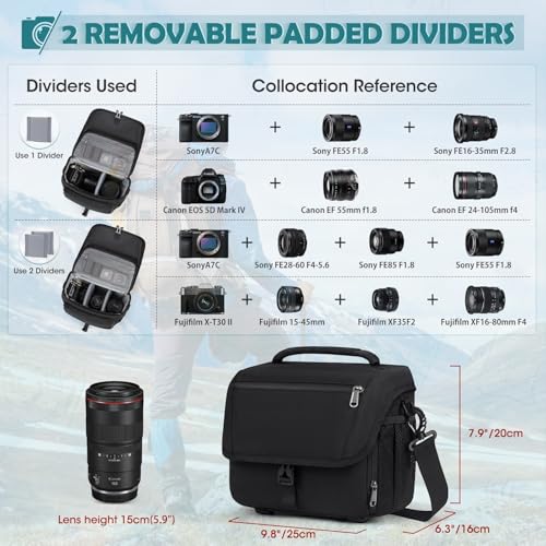 - 【مساحة تخزين متعددة وقابلة للتخصيص】تنقسم حقيبة الكاميرا إلى جزأين مساحة التخزين: تتضمن المساحة الخارجية جيب علوي بسحاب، وجيب خلفي مضاد للسرقة، وجيبين شبكيين جانبيين وجيب سفلي مع غطاء للمطر. تتضمن المساحة الداخلية مساحة تخزين رئيسية واحدة وجيب شبكي علوي وجيب بفتحة كبيرة وجيب أمامي متعدد الوظائف. مساحة تخزين رئيسية مع 2 فواصل قابلة للإزالة توفر مساحة داخلية واقية وقابلة للتخصيص لتناسب أحجام الكاميرات المختلفة.