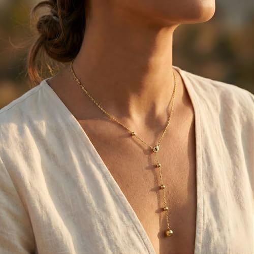 Generic - عقد لاريات ذهبي للنساء من اكسسوار - قلادة انيقة من الخرز على شكل حرف Y مع قلادة متدلية على شكل كرة مصقولة - سلسلة بطبقات بسيطة هدية للنساء
