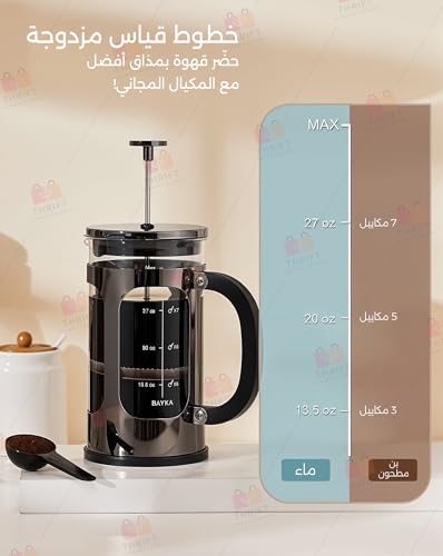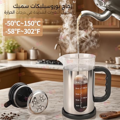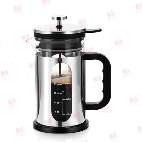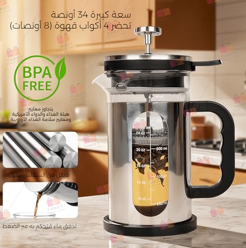 Thrift - ماكينة تحضير القهوة الفرنسية بالضغط شديدة التحمل - سعة 900 مل، دورق زجاج البوروسيليكات وخطوط مزدوجة المقياس واطار من الستانلس ستيل وترشيح 4 مستويات (900 مل)