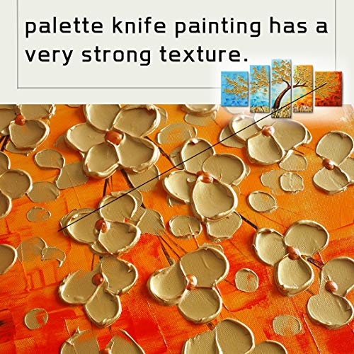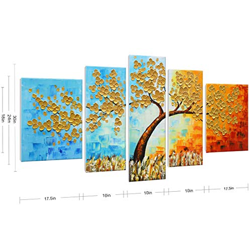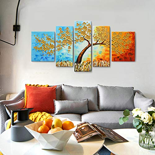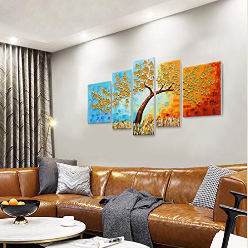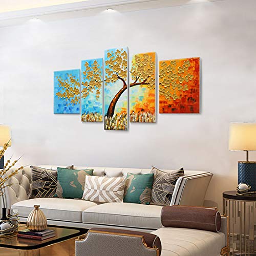 amatop - لوحة فنية جدارية كبيرة جدًا مرسومة يدويًا 100% بألوان الزيت على قماش ثلاثية الأبعاد لشجرة ملونة باستخدام سكين الباليت واللمسة السميكة رسوم تجريدية مناسبة لغرفة المعيشة والنوم أو المكتب، ذهبي، 5 قطع