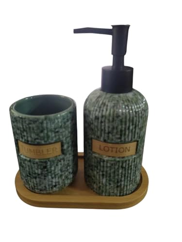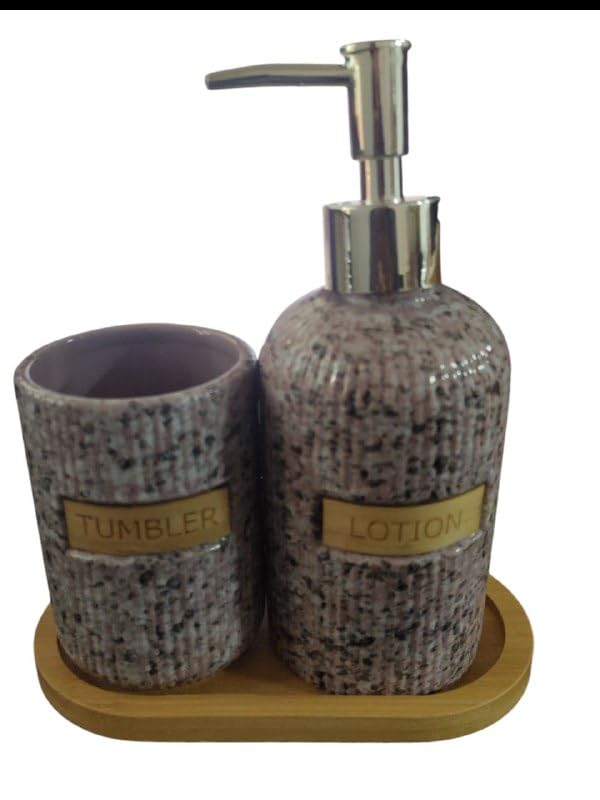 - يتميز الطقم بتصميم مزخرف مميز وملصقات شفافة، حيث يجمع هذا الطقم الذي يتضمن موزع لوشن وكوب وقاعدة خشبية للصابون بين الأناقة والوظيفة العملية.
