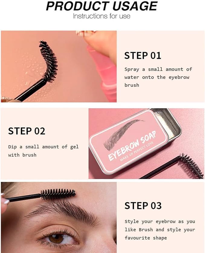 - سهلة الاستخدام: رشي رأس الفرشاة مبللًا، ثم مشطي صابون الحواجب برأس الفرشاة المبلل قليلاً وقم بتمشيط حاجبيك بشكل متكرر لأعلى حتى يلتصق كل شعر حاجب بصابون التشكيل للحصول على تأثير تشكيل.