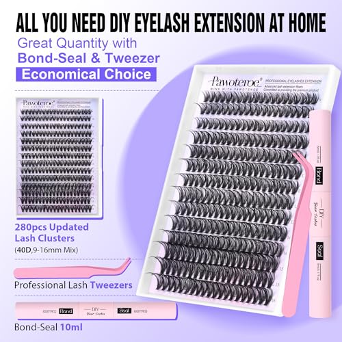 Pawotence - مجموعة وصلات رموش فردية مكونة من 280 قطعة، مجموعة رموش فردية مجعدة 40 دي بطول 9-16 ملم مع رباط وختم وملقط رموش للاستخدام الذاتي (40D، 0.07D، 9-16 ملم، للمجموعة)