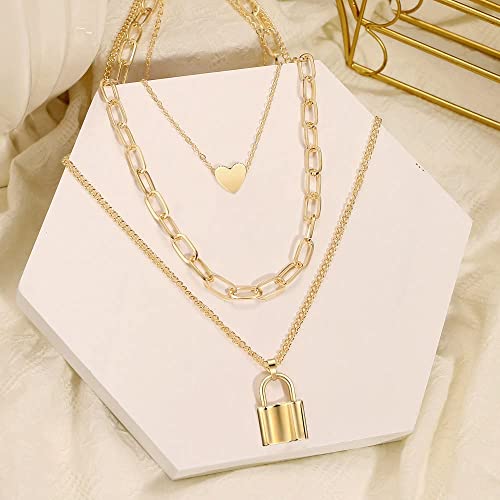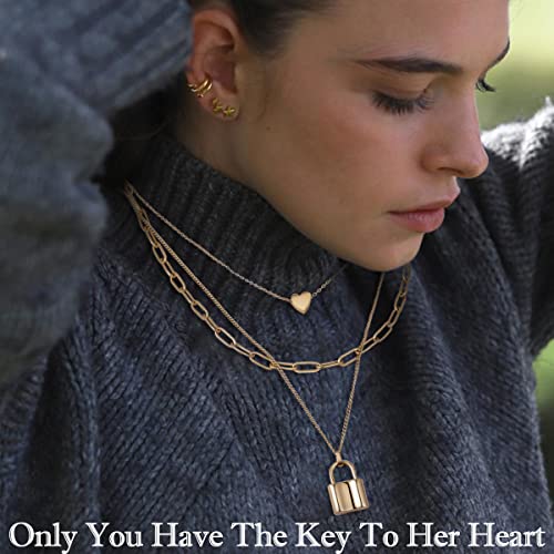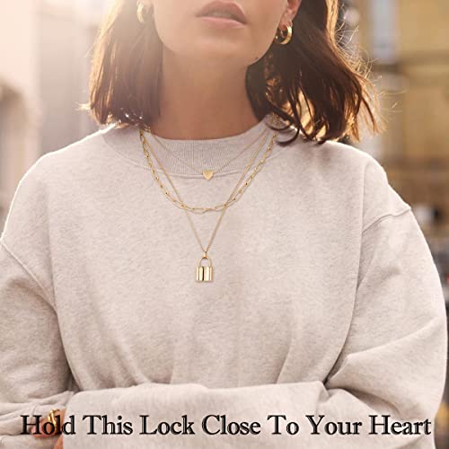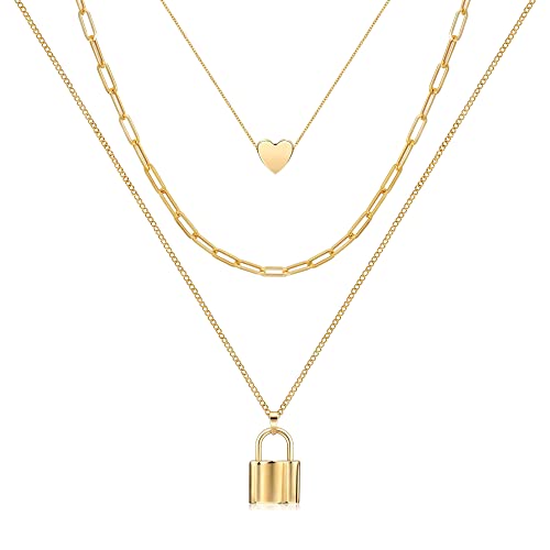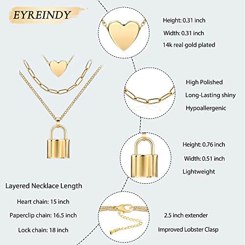 Eyreindy - عقد ذهبي متعدد الطبقات للنساء من ايريندي سلسلة قفل مطلية بالذهب عيار 14 قيراط سلسة على شكل قلب بمشبك ورق هدايا عيد الحب لها