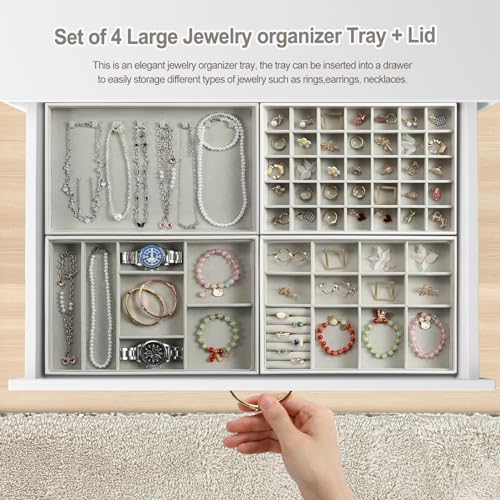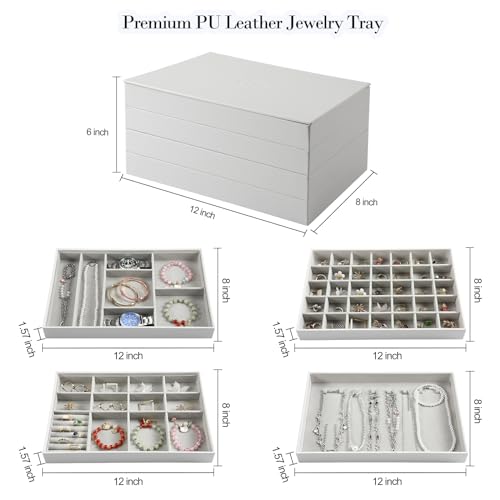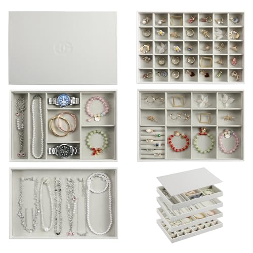 EZDeco - منظم مجوهرات مزود بغطاء من اي زد ديكو مجموعة 4 حوامل قابلة للتكديس للأدراج طاولة عرض لتخزين المجوهرات الجلد الصناعي للخواتم والحلقان والسلاسل والأساور رمادي جلد صناعي