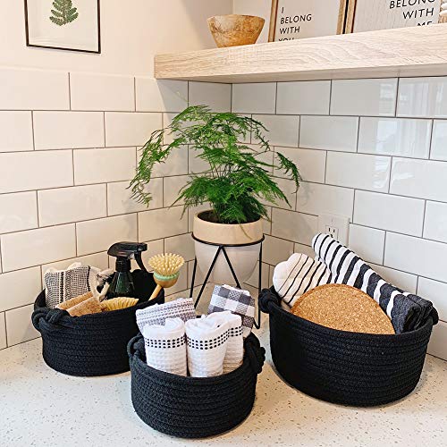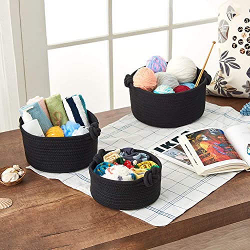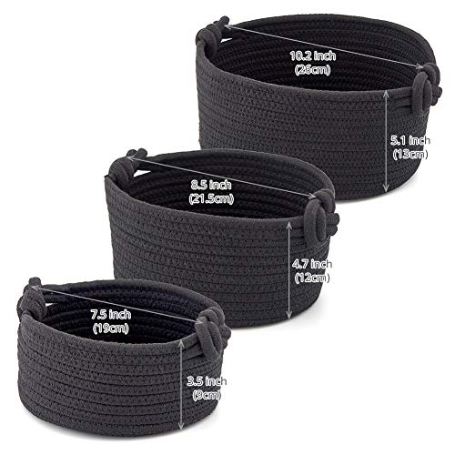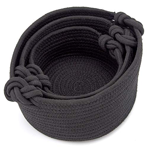 EZOWare - سلل دائرية منسوجة صغيرة مكعبة مصنوعة من حبال قطن، صناديق تنظيم وتخزين منسوجة لطاولة تغيير الملابس، خزائن الأطفال، ديكور غرفة لألعاب القطط والكلاب والفوط والهدايا من ايزووير، مجموعة من 3 قطع، لون أسود