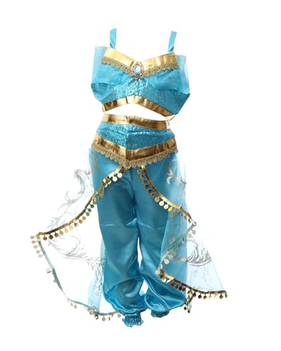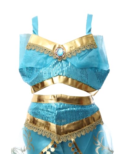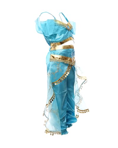 El Maayergy - زي الأميرة ياسمين F-7 مع وشاح ومجوهرات، رائع للهالوين - لون أزرق مخضر، مقاس سمول S