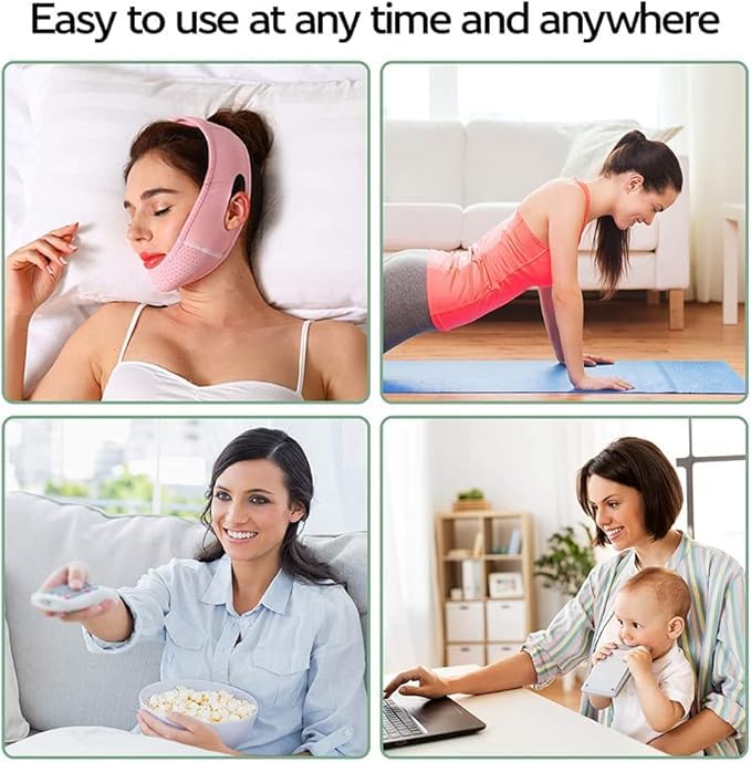 - تصميم على شكل حرف V: تتميز الضمادة بتصميم فريد على شكل حرف V يساعد في توجيه وتحفيز مناطق معينة من الوجه والذقن، مما يعزز الشكل العام ويقلل من ظهور الذقن المزدوجة. هذا التصميم يسمح بتوزيع الضغط بشكل متوازن على البشرة ليحسن من مرونتها ويقلل من التجاعيد.