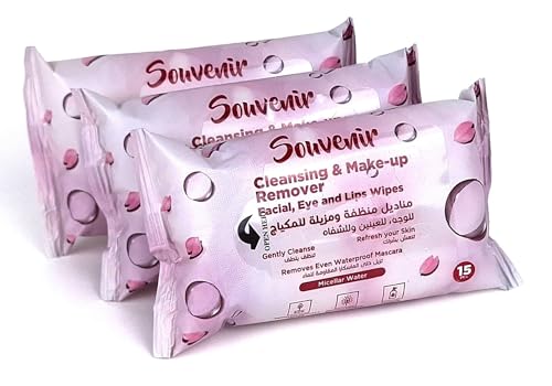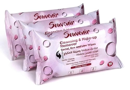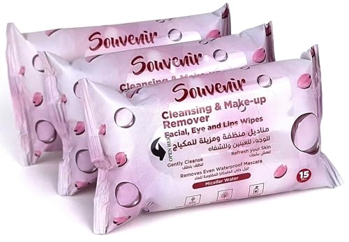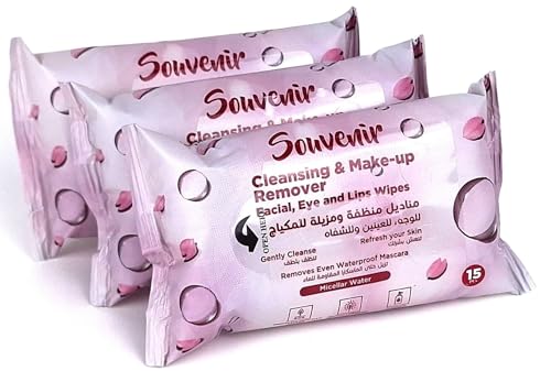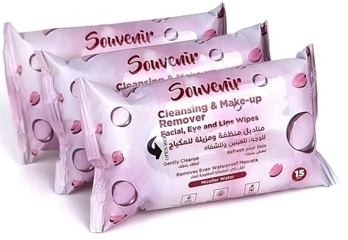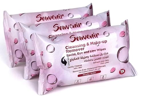 Generic - مناديل مبللة لإزالة المكياج بماء ميسيلار لتنظيف الوجه والعين والشفاه من سوفينير، 3 قطع